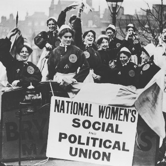 Na imagem participantes da União das mulheres posam para foto segurando um cartaz escrito Women’s Social Political Union.