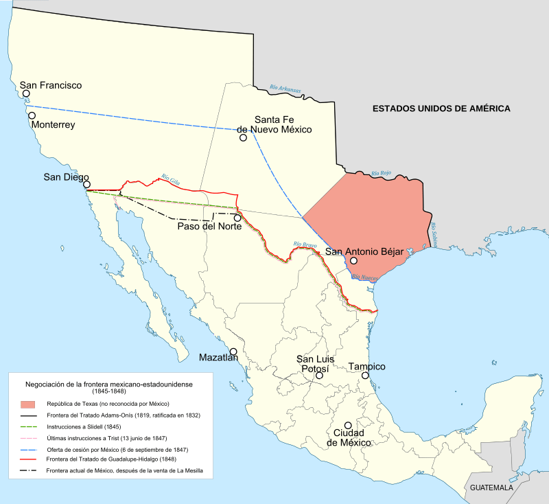 Há 175 anos era ratificado pelo México o Tratado de Guadalupe-Hidalgo, onde o país latino-americano cedia pela quantia de US$ 15 milhões os territórios da Califórnia, Utah e Nevada, além de partes de outros 4 estados modernos dos EUA. Foi o desfecho de um conflito iniciado oficialmente com a Guerra Mexicano-Americana, mas que remonta às ideias do Destino Manifesto.