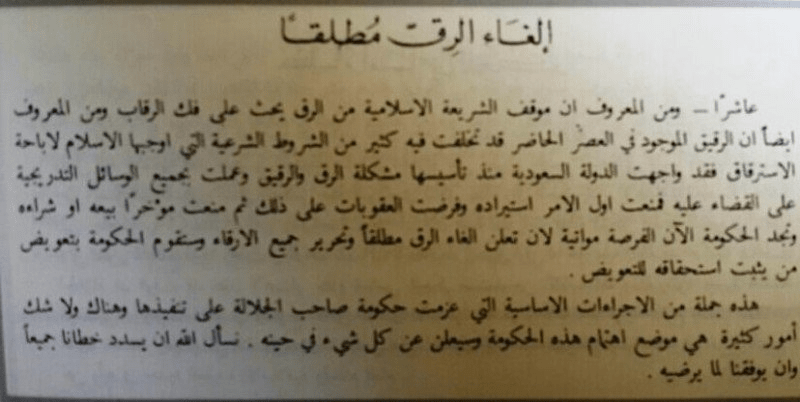 Na imagem, trecho do decreto que extingue oficialmente a escravidão na Arábia Saudita, 1962.