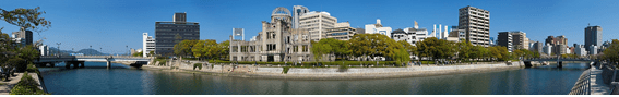 Vista de 180º graus do Memorial da Paz de Hiroshima. A cúpula Genbaku foi uma das únicas estruturas a permanecer de pé após a explosão