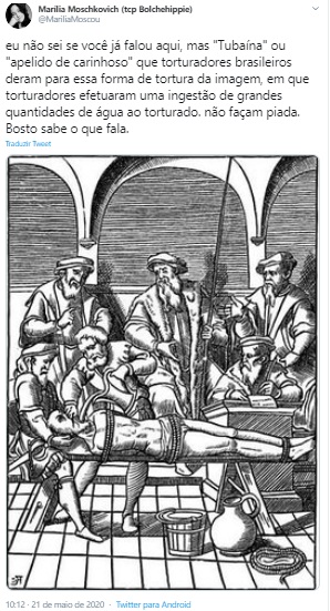 Mas a narrativa ganhou ainda mais força quando a socióloga Marília Moschkovich publicou um texto no Facebook para fundamentar o alerta que ela já havia feito no Twitter: “não façam piada”. Para ela, “tubaína” é o apelido “que torturadores brasileiros deram para essa forma de tortura da imagem”, afirmou se referindo à xilogravura extraída do Praxis rerum criminalium, já citado anteriormente.