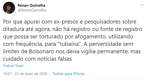 Renan Quinalha postou em sua conta do Twitter: “Por que apurei com ex-presos e pesquisadores sobre ditadura até agora, não há registro ou fonte de registro que possa ser torturado por afogamento, utilizando com frequência, para ‘tubaína’”. Quinalha é professor de Direito na Universidade Federal de São Paulo (Unifesp) e atuou como advogado da Comissão da Verdade do Estado de São Paulo.