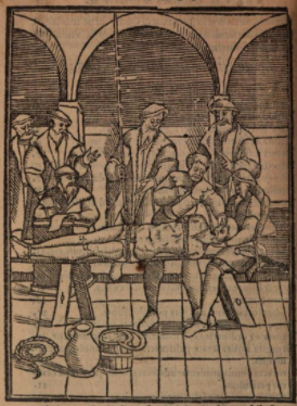 Um dos registros mais antigos e consistentes dessa prática foi feito por um jurista flamengo chamado Joos de Damhouder (1507-1581), que publicou em 1554 o Praxis rerum criminalium, um grande manual de práticas jurídicas. O método aparece representado em uma xilogravura (imagem abaixo) que ilustra o 37º capítulo da obra, dedicado aos interrogatórios e à tortura.