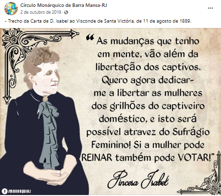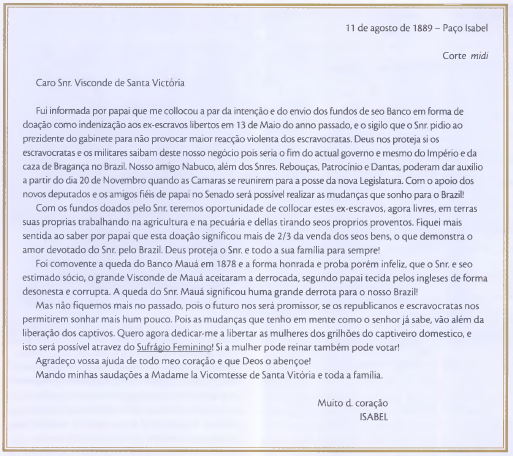 A reportagem também citava a biografia feita por Roderick J. Barman, onde a princesa é descrita como uma mulher ajustada às expectativas de uma sociedade tradicional: “D. Isabel obedecia ao marido na administração de sua vida, tanto pública como privada”. Esse perfil contrasta com o trecho da carta em que se manifestava o desejo de “libertar as mulheres dos grilhões do cativeiro doméstico”.