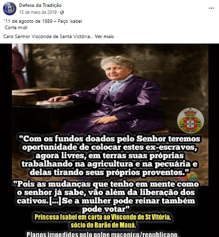 Páginas no Facebook como Pedro II do Brasil, Por que Monarquia?, Vamos falar de História?, Círculo Monárquico de Barra Mansa-RJ, Defesa da Tradição, entre muitas outras, estão replicando trechos da carta sem contextualizarem todo o debate que existe em torno dela (veja abaixo prints de postagens). Alguns sites também publicaram textos com base na carta, contribuindo para propagar um perfil da princesa que não se verifica em todas as outras correspondências de Isabel, conforme Barman, Cerqueira, Rezzutti e outros pesquisadores já alertaram.