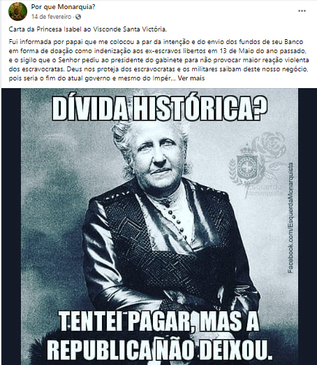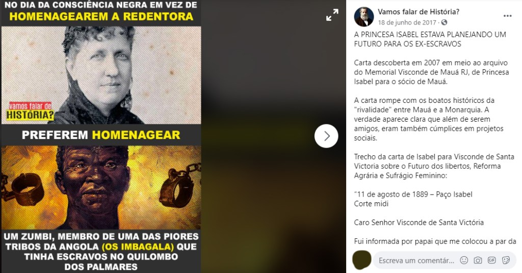 Em tempo, esta checagem foi publicada originalmente no site Máquina dos Tempos, no dia 4 de julho de 2020. Na ocasião, recebemos o generoso contato de Bruno Cerqueira, que ressaltou o fato de Fátima Argon nunca ter recebido a carta em mãos e nem ter afirmado que ela fosse verdadeira. A chefe do AHMIP teria apenas declarado que a grafia presente na carta era similar à da princesa Isabel. A equipe do PROJETO DETECTA tentou contato diretamente com Argon, mas não obteve resposta. O fato de o documento original não estar disponível para um exame mais apurado de especialistas torna ainda mais frágil sua utilização como evidência histórica.