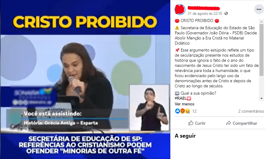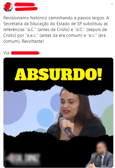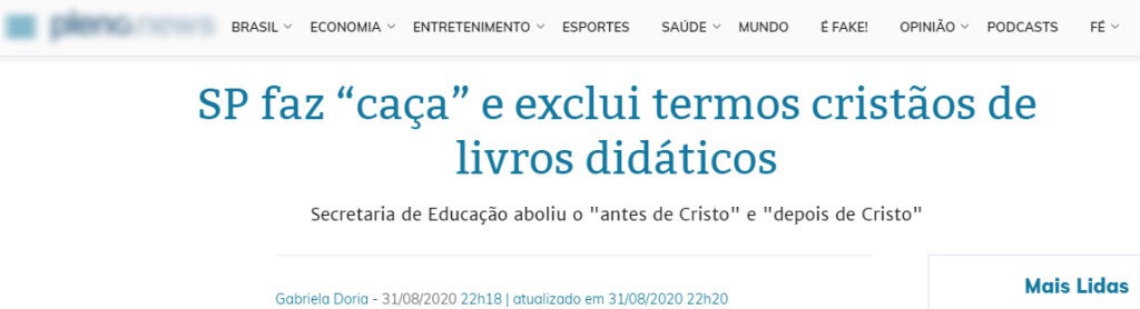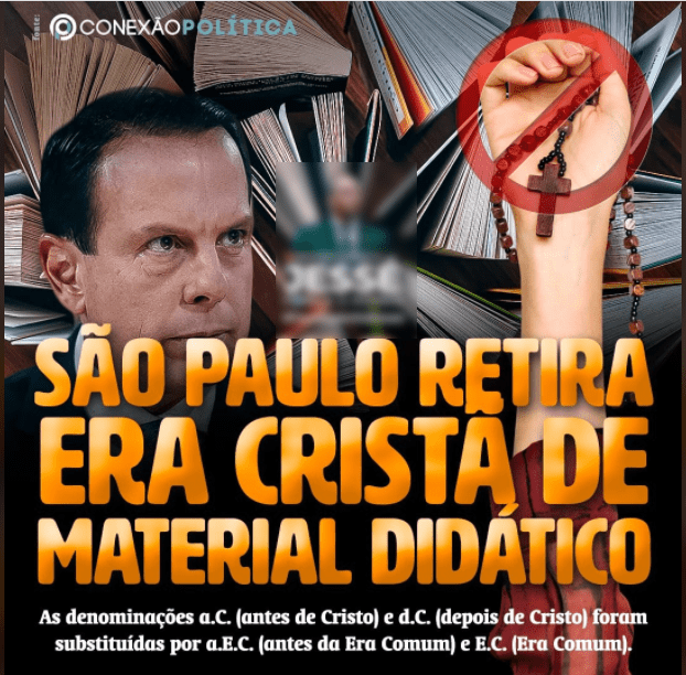 Foi nesse furor pré-eleitoral que, em fins de agosto do ano passado, surgiu um boato de que a Secretaria de Educação do Estado de São Paulo teria abolido os termos “antes de Cristo” (a.C.) e “depois de Cristo” (d.C.) nos livros didáticos. Esses termos costumam ser usados para diferenciar a contagem dos anos anteriores e posteriores ao nascimento de Jesus Cristo, de acordo com o calendário gregoriano.