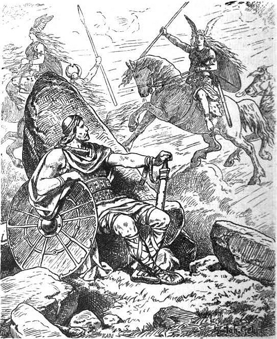 - Ilustração retratando as valquírias carregando o corpo de um guerreiro morto para o Valhalla e lá são recepcionados pelo deus Heimdallr. De autoria de Lorenz Frølich e datado de 1906