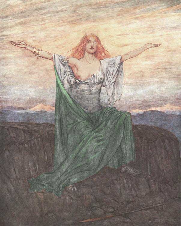 - Ilustração em aquarela retratando Brunhilda acordando e saudando o dia e Siegfried, retirada do livro Siegfried and the Twilight of the Gods, de Arthur Rackham