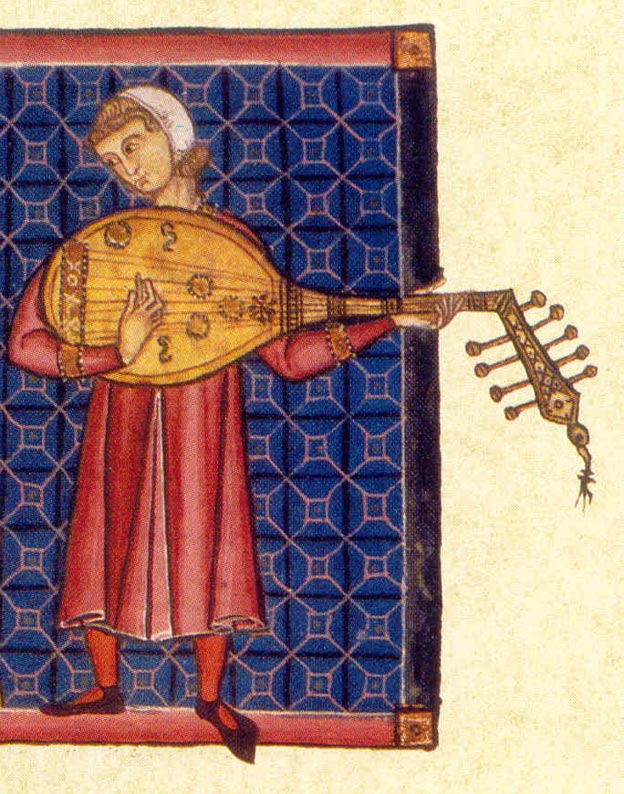 - Iluminura retirada de manuscrito não identificado das Cantigas de Santa Maria retratando um musicante tocando o alaúde