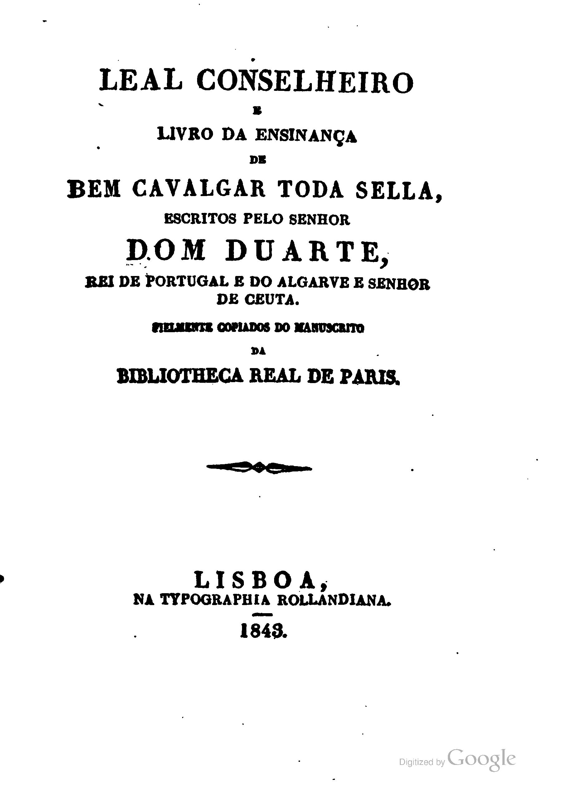 - Frontispício de edição de 1843 do Livro da Ensinança de Bem Cavalgar Toda Sela