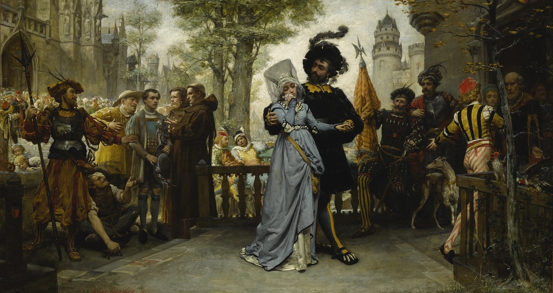 - Óleo sobre tela Le Droit du Seigneur, datado de 1874 e assinado por Vasily Polenov.