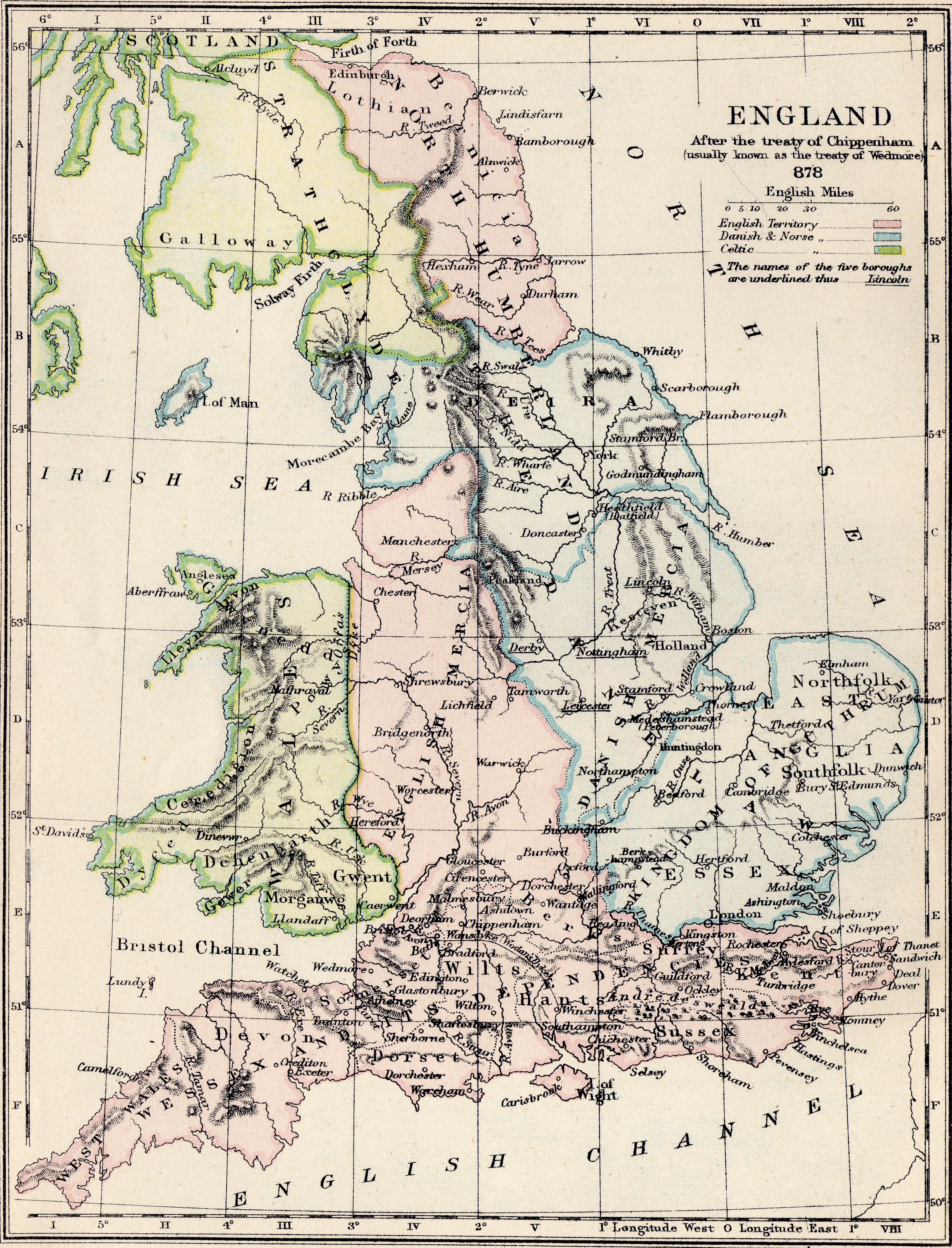 - Mapa datado de 1862 mostrando os domínios de anglo-saxões e daneses